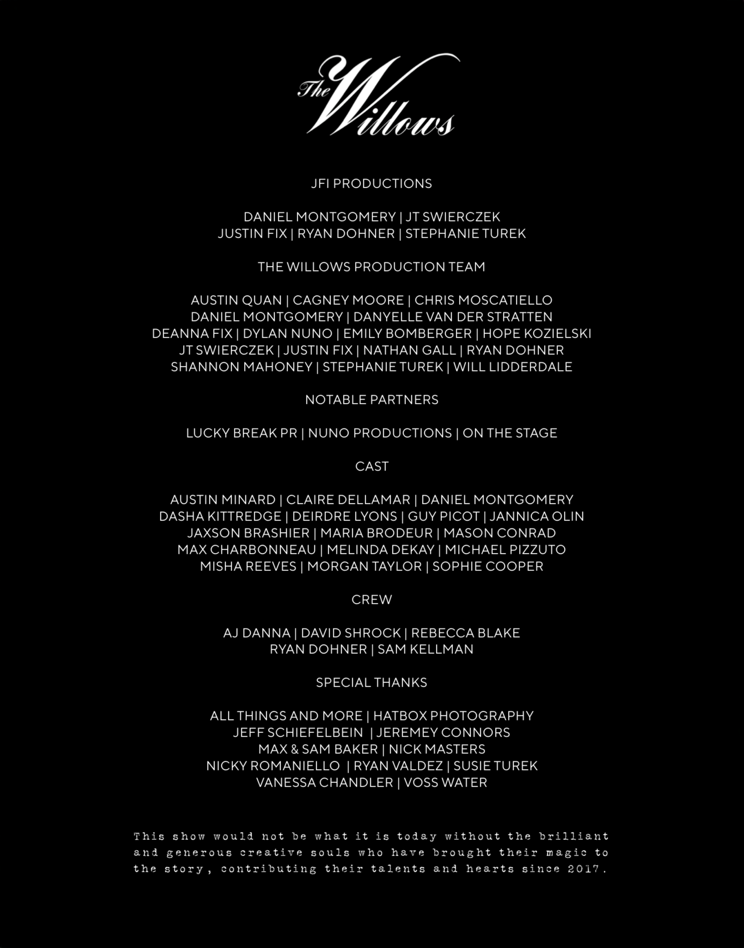 Having been part of The Willows family since the first show, Dasha is thrilled at its return. Credits include Gumball Dreams (SXSW Audience Award), Creep LA, Haus of Creep, LORE, Rochester 1996, Crimson Cabaret, Delusion, and The Wild Party. Dasha was a live actor and writer for Tender Claws & Oculus' VR experience The Under Presents (Emmy Nominated). She recently cast, performance directed and co-wrote Peacock & Blumhouse's immersive activation Overnightmare at the Stanley Hotel (EX Award Winner 2025) and cast and talent coordinated NBC's The SNL Experience. She is an NYU Tisch, UCB, and Moscow Art Theatre alumna. Connect @dashakittredge